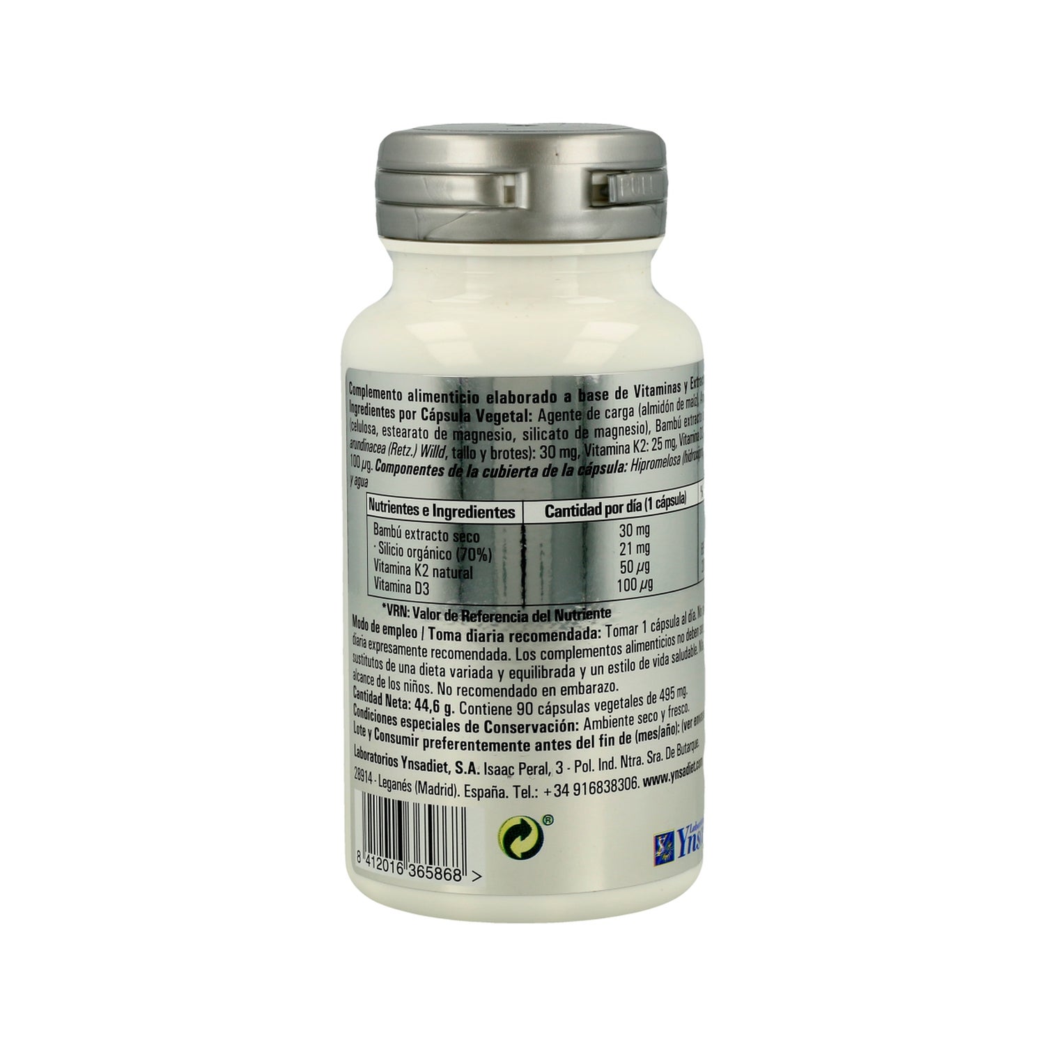 Suplemento alimentar formulado com vitamina D3, K2, silício orgânico e extracto de bambu. Sem glúten. Contribui para o funcionamento normal do sistema osteoarticular. Adequado para pessoas que necessitam de fortalecer a saúde óssea e imunitária. Não adequado para mulheres grávidas.