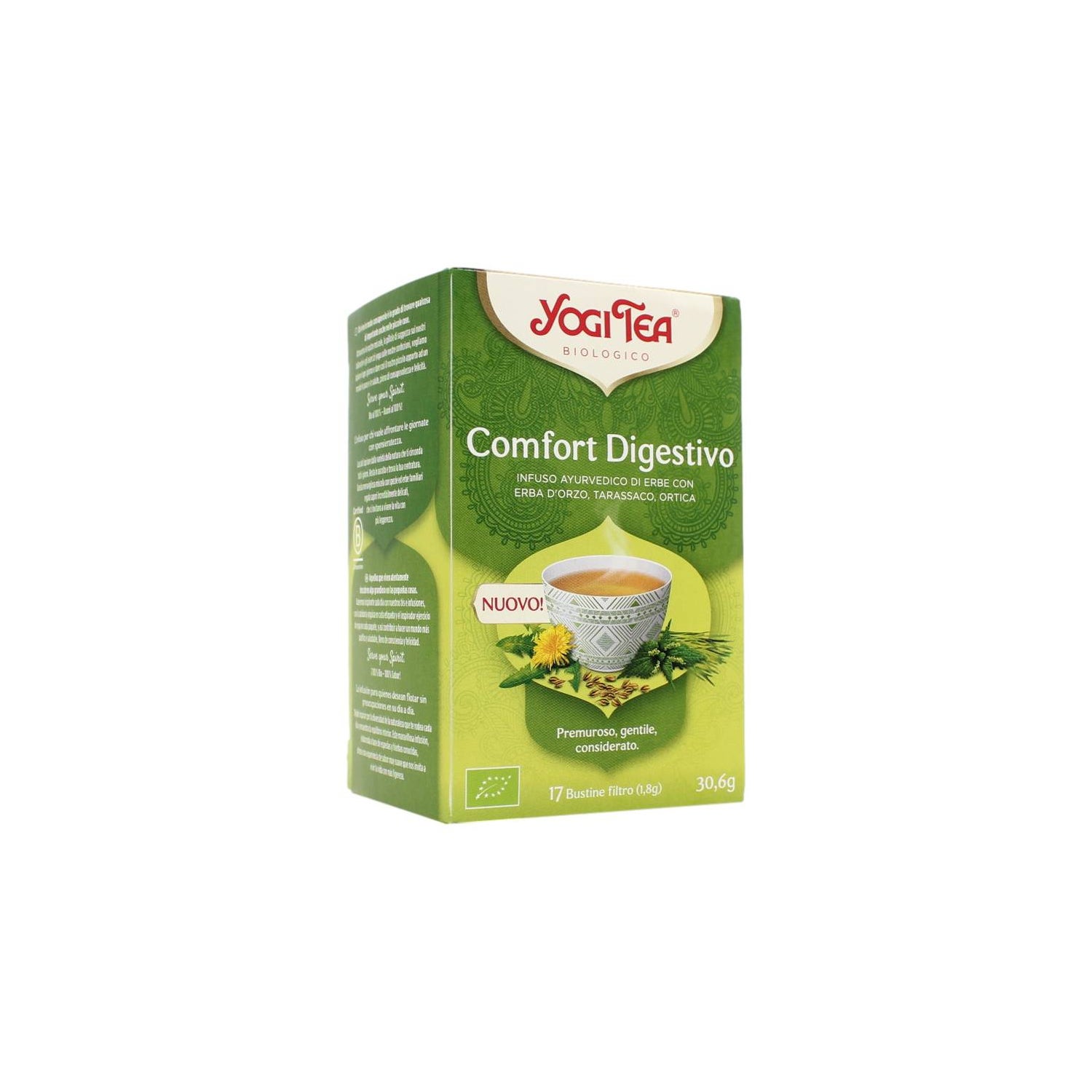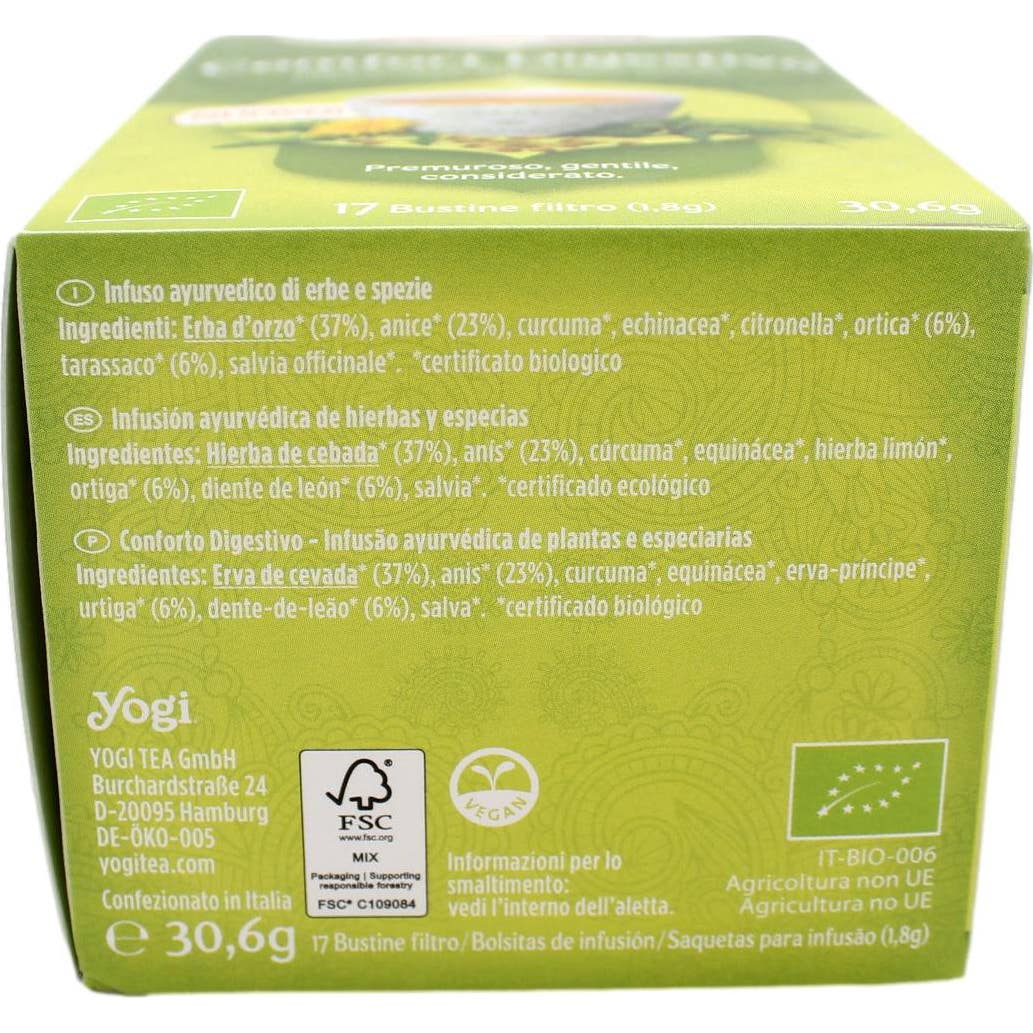 Yogi Tea Confort Digestivo Bio 17 Bolsitas é uma infusão ayurvédica ecológica sem cafeína, pensada para favorecer uma digestão leve e aportar bem-estar após as refeições. Oferece um sabor suave e equilibrado, adequado para qualquer momento do dia.
