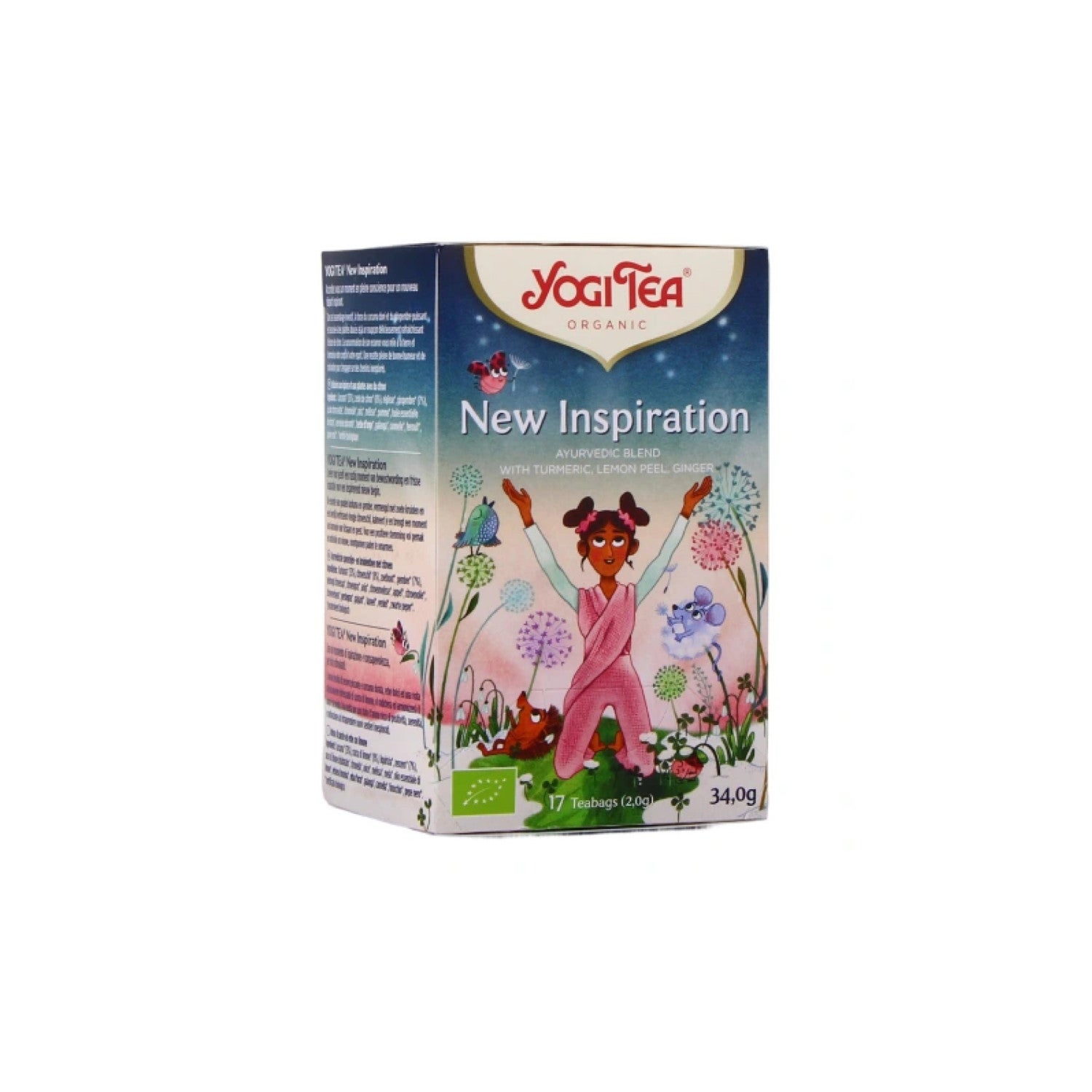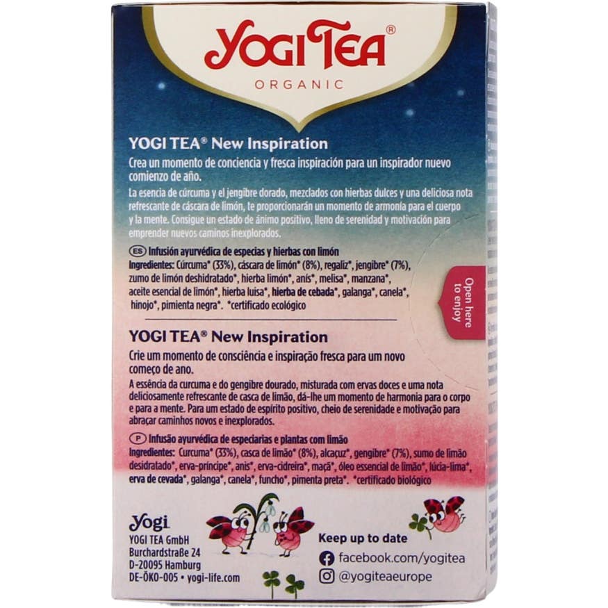 Yogi Tea Infusão Nova Inspiração 17 Sachês para energia natural e clareza mental é uma infusão ecológica sem cafeína, pensada para proporcionar um impulso revitalizante. Combina especiarias ayurvédicas como cúrcuma e gengibre com notas cítricas de casca de limão.