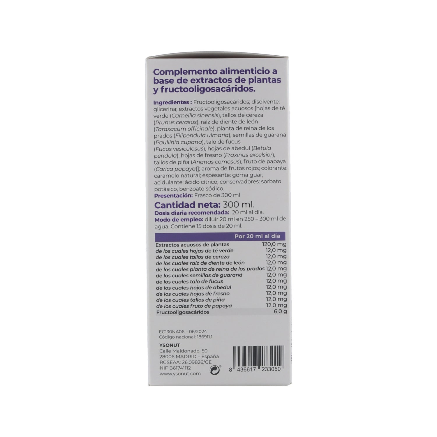 EXTRACTOS AQUOSOS, COM 15% DE PLANTAS EM PARTES IGUAIS: FOLHAS DE CHÁ VERDE, COLA DE CEREJA, RAIZ DE CARDILLO, RAINHA DOS PRADOS, SEMENTE DE GUARANÁ, TALO DE FUCUS, FOLHA DE BÉTULA, FOLHA DE FREIXO, ANANÁS, FOLHA DE PAPAIAFRUTO-OLIGOSSACÁRIDOS