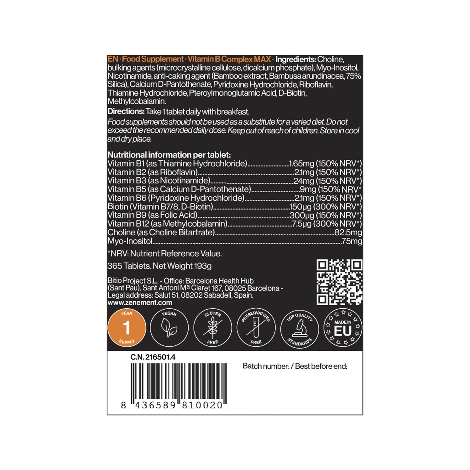 Suplemento alimentar baseado num complexo multivitamínico, 100% adequado para dietas veganas. Contém todas as vitaminas do complexo B, enriquecidas com colina e inositol. Estes nutrientes actuam sinergeticamente no metabolismo dos aminoácidos e desempenham um papel considerável na saúde da pele, do cabelo e das unhas. Ajuda o sistema hormonal a funcionar correctamente e reduz a sensação de fadiga. Suporta níveis adequados de colesterol, ao mesmo tempo que contribui para a função psicológica normal. Fabricado em Espanha sob normas sanitárias, isento de glúten, lactose e soja.