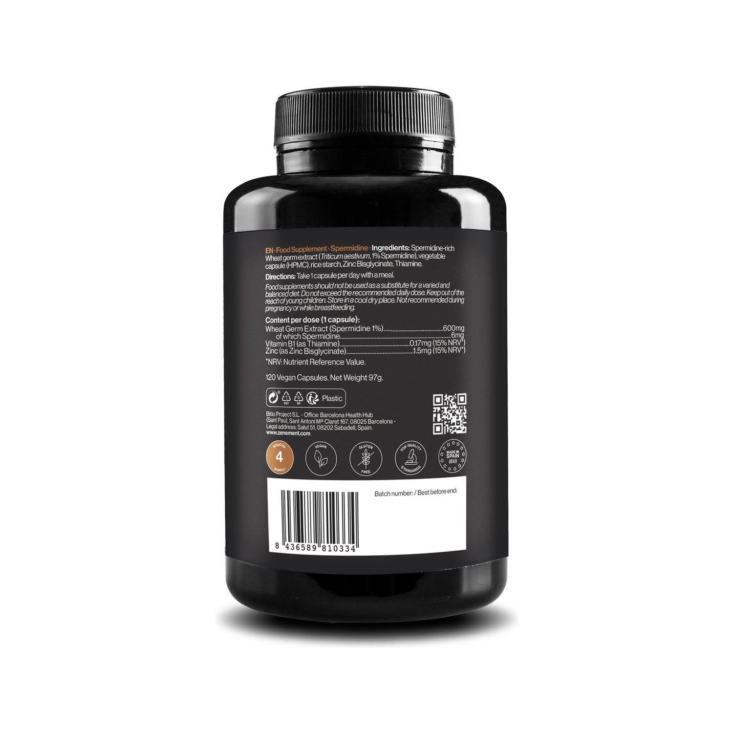 Zenement Spermidine 120caps é um suplemento alimentar que ajuda a melhorar o processo de regeneração celular e a prevenir a degeneração celular. Contribui igualmente para a manutenção de uma boa saúde cardiovascular. Adequado para veganos. Contém 120 cápsulas.
