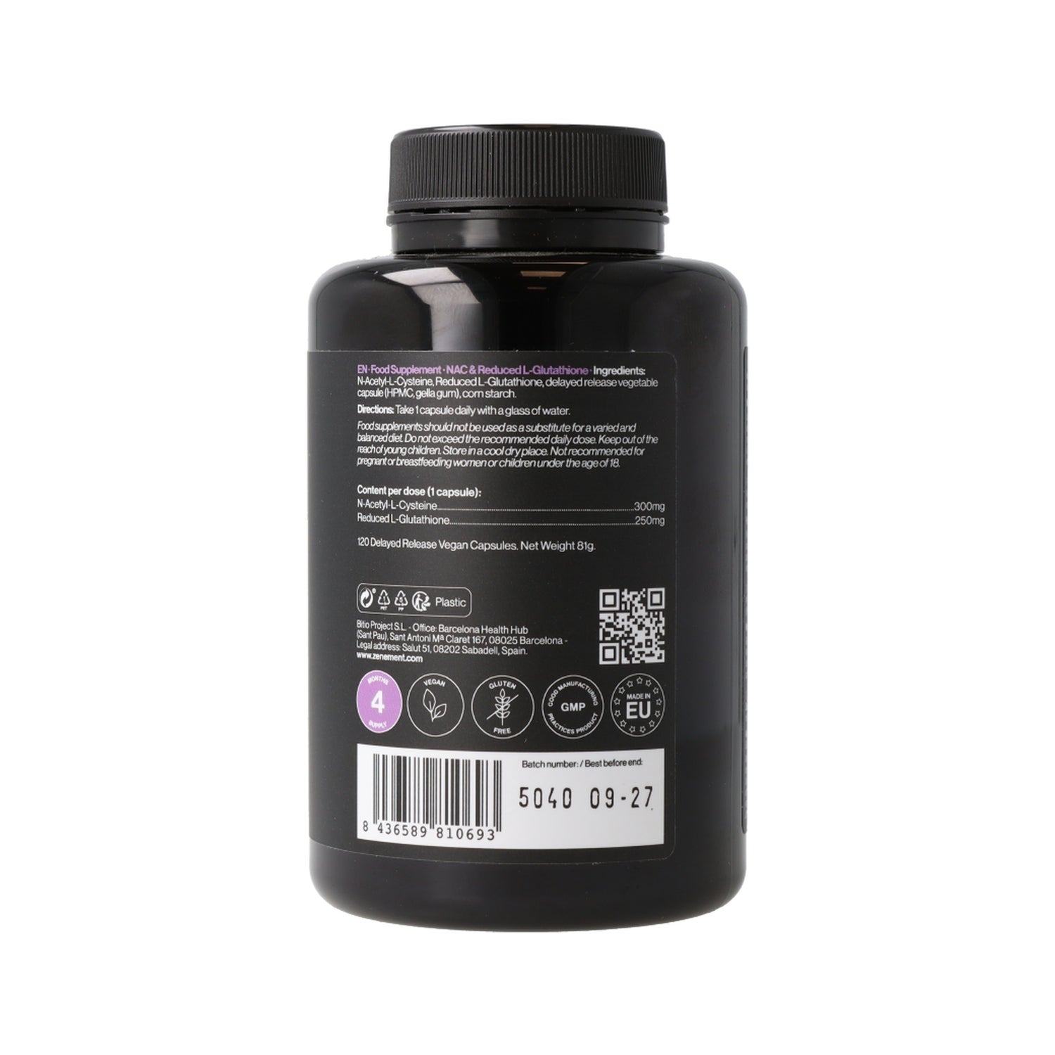 O NAC (N-Acetil-Cisteína) é uma forma estável de L-Cisteína, um aminoácido que contribui para a síntese do Glutationa, um antioxidante essencial nas células do corpo. Esta fórmula sinérgica potencializa os efeitos antioxidantes, protegendo as células do dano oxidativo. Com 120 cápsulas veganas gastrorresistentes, nosso suplemento garante uma alta absorção e biodisponibilidade. - Fórmula sinérgica de NAC e Glutationa - Cápsulas gastrorresistentes para máxima absorção - Alta potência e fornecimento para 4 meses